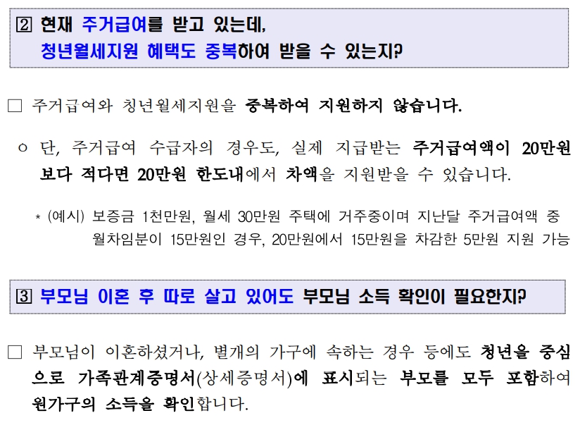 - 군입대, 90일 초과 외국에 체류, 부모와 합가/전출 후 변경 신청 누락 등의 경우 월세 지원 중지 가능