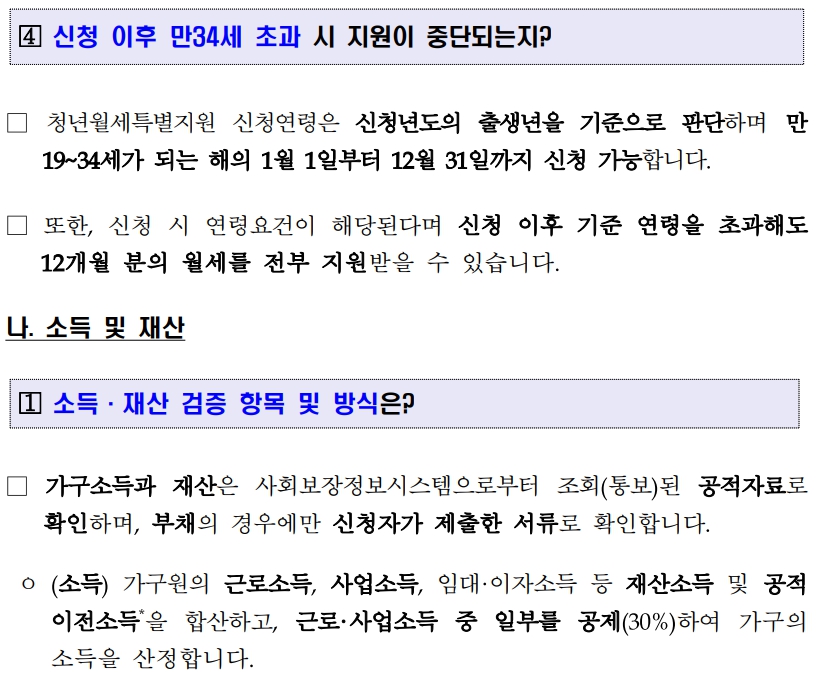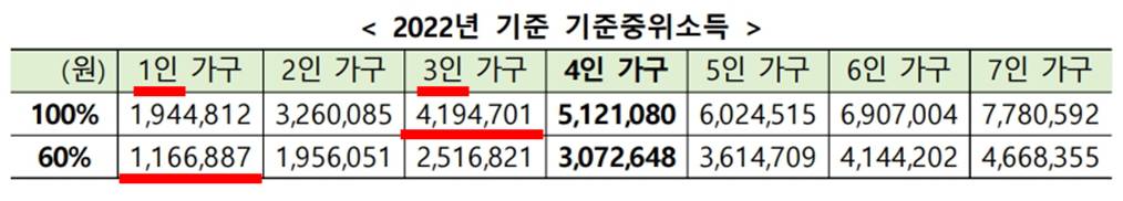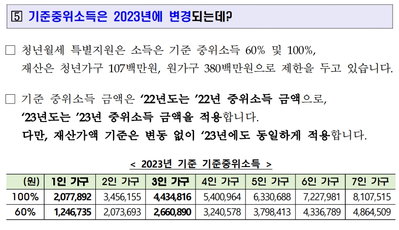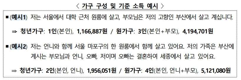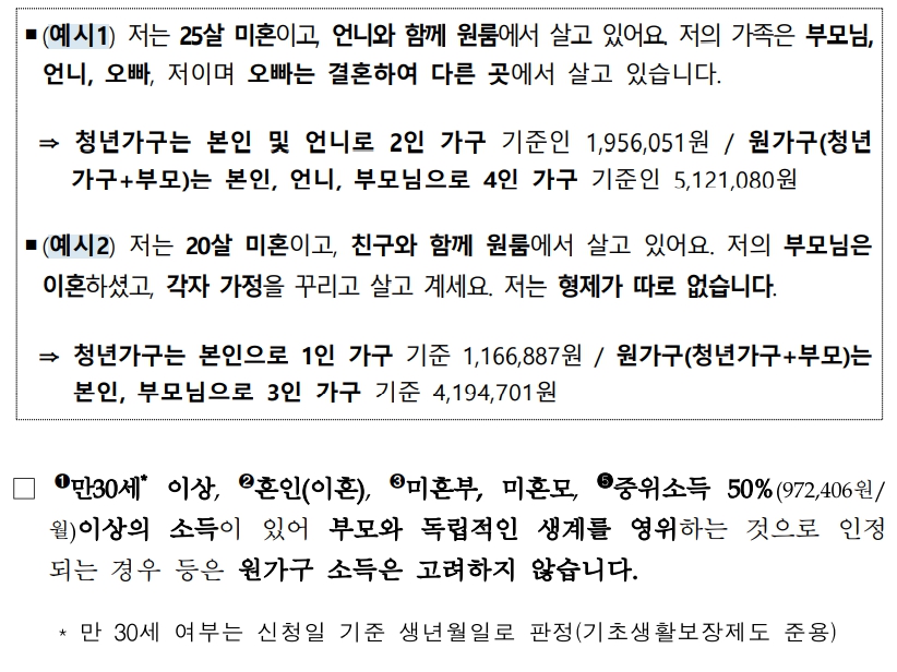 - 만30세 이상, 혼인, 미혼부·모 또는 기준 중위소득의 50%(1인기준 월 972,406원) 이상의 소득이 있어 부모와 생계를 달리한다고 볼 수 있는 청년은 부모와 관계없이 청년가구의 소득ㆍ재산만 확인