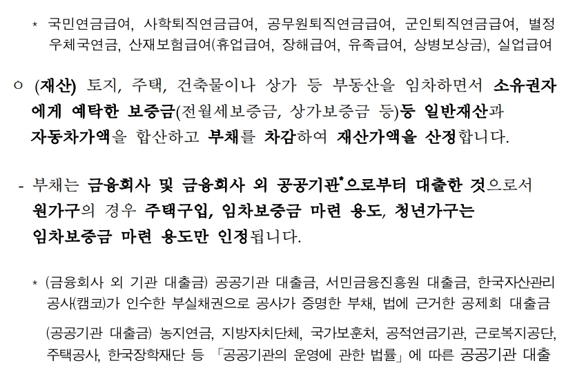 - 가구원이 소유하는 주택, 토지, 건축물 및 부동산을 임차하면서 소유권자에게 예탁한 보증금(임차보증금)과 자동차가액 등을 합산하고 주택구입 또는 주택임차 목적의 대출금을 차감하여 산정