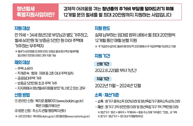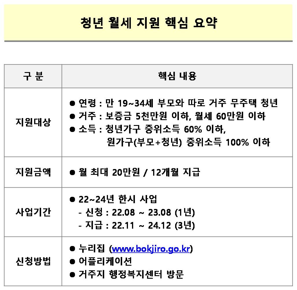 ◎ (지원대상) 만19세부터 34세까지 부모와 따로 거주하는 무주택 청년◎ (소득요건) 청년가구 중위소득 60%이하와 원가구(부모+청년) 중위소득 100%이하◎ (신청) 8.22일