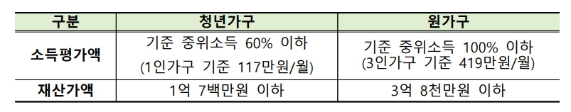 3) 소득/재산 요건 : 청년가구 뿐만 아니라 청년과 부모를 포함한 원가구 소득/재산이 모두 일정 기준을 충족해야 지원 가능