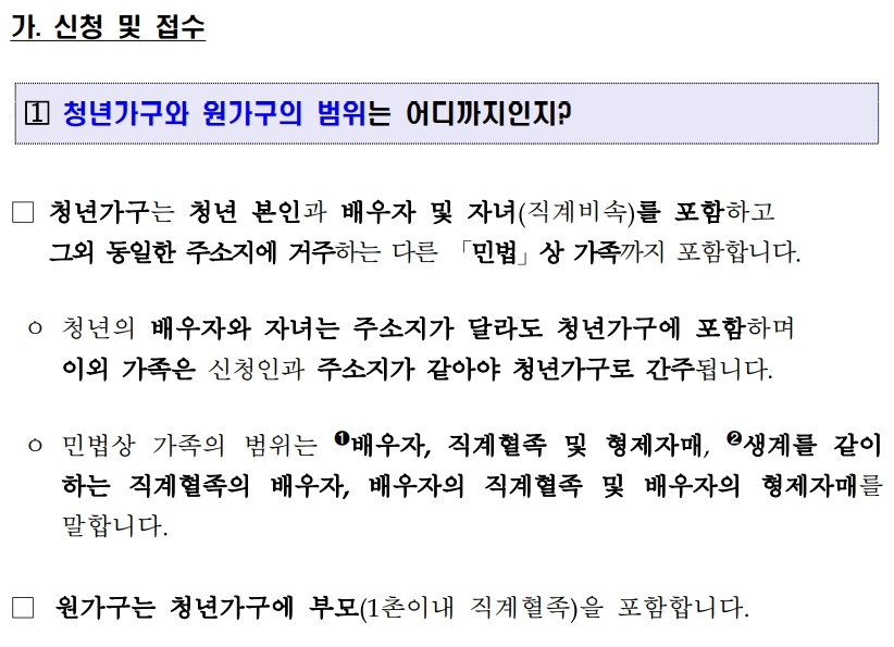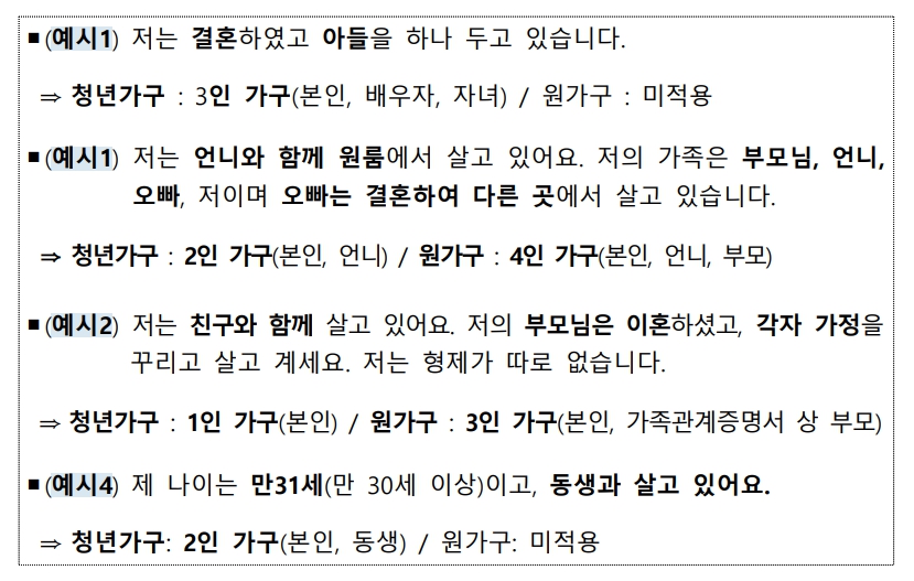 - 청년가구 : 청년 본인과 배우자, 자녀를 말함 / 본인과 배우자의 부모, 형제자매 등 다른 가족이 청년과 함께 거주하는 경우에는 해당 가족도 청년가구에 포함됨