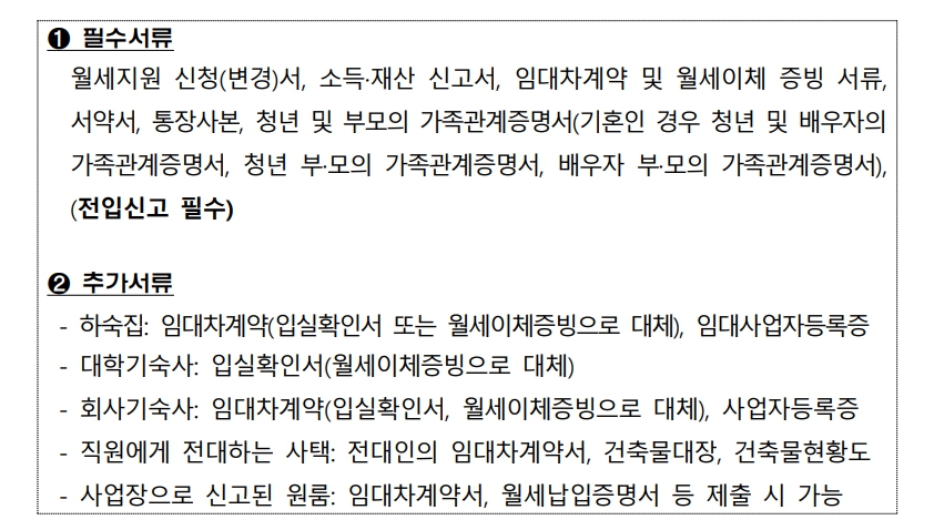 - 임대차계약 증빙 서류(임대차계약서, 전대차계약서, 입실서, 기숙사비 납부 영수증 등)